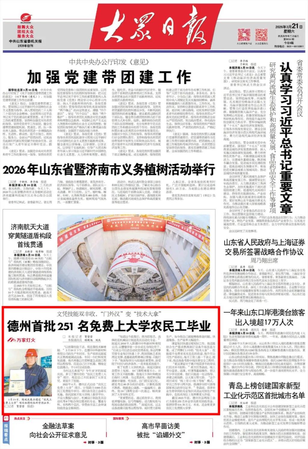 近日,《大众日报》头版报道,德州首批251名免费农民工大学生顺利毕业。作为项目承办单位,德州职业技术学院精准对接产业需求,以线上线下相结合的方式,帮助农民工实现学历与技能双提升,让基层劳动者成长为技术骨干。这既是学校发挥职教优势、服务地方发展的具体实践,更是主动担当、助力乡村人才振兴的生动体现。学校将持续办好惠民教育,为区域发展培育更多高素质高技能人才。